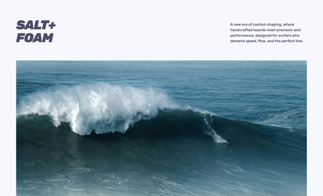 Create a bold and energetic one-page website for my skate and surf shop, with sections for our products, brand story, team riders, and an embedded map of our location.
