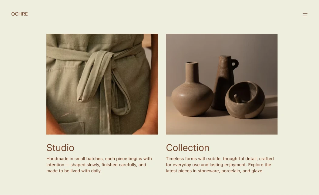 Create a minimalist and earthy landing page for my ceramics studio, featuring a gallery of my work, an artist statement, and a contact form for commissions.
