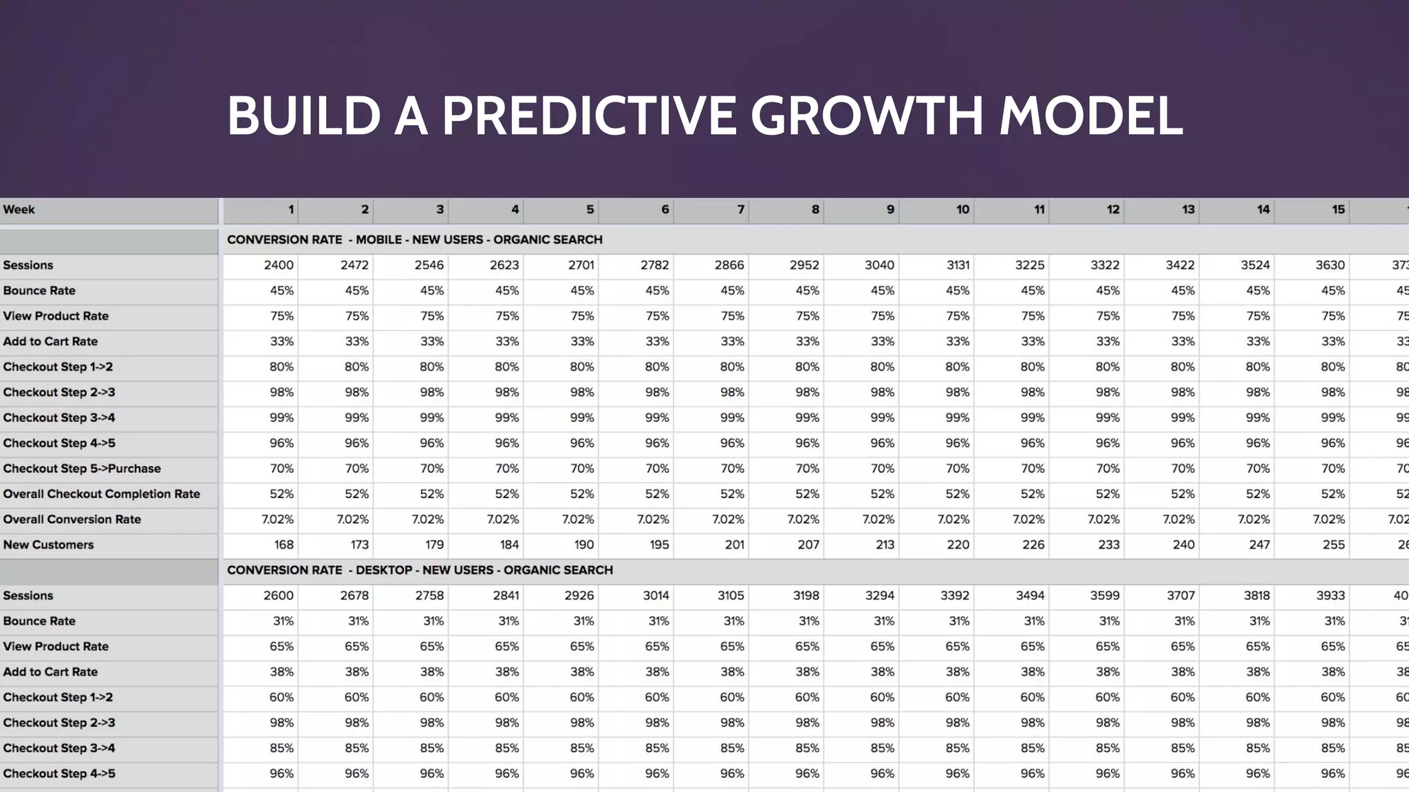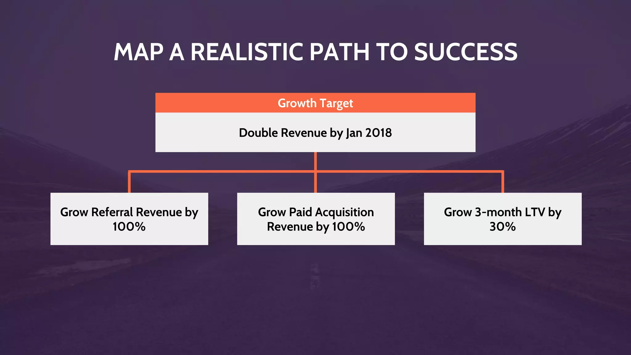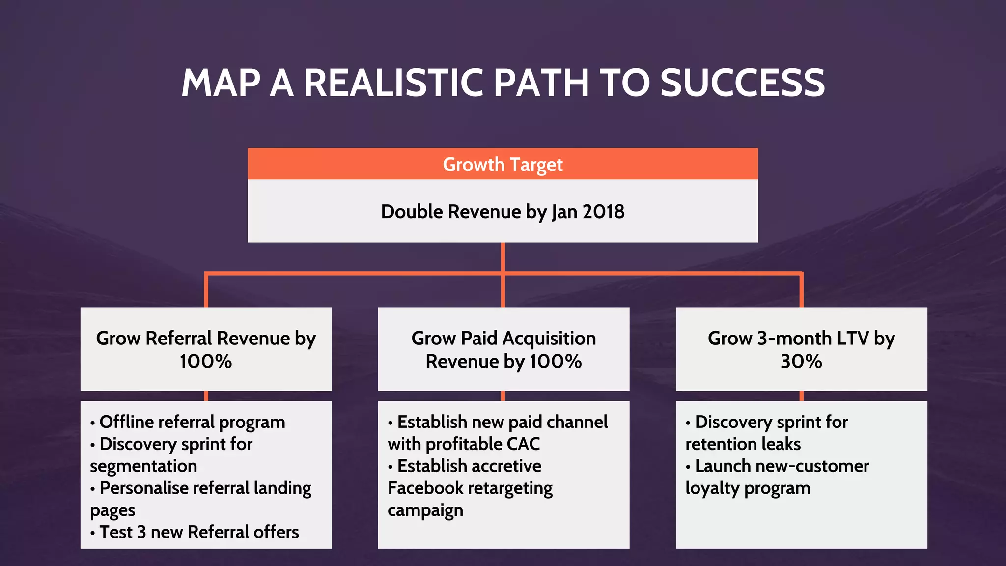 The document outlines a strategic approach to growth by identifying and aligning on a 'north star' metric and mapping key inputs that drive this growth. It emphasizes the importance of understanding customer revenue, focusing on conversion rates, and utilizing predictive growth models to achieve ambitious targets, such as doubling revenue. The framework encourages a systematic process of ideation and experimentation to uncover underlying issues and optimize growth efforts.