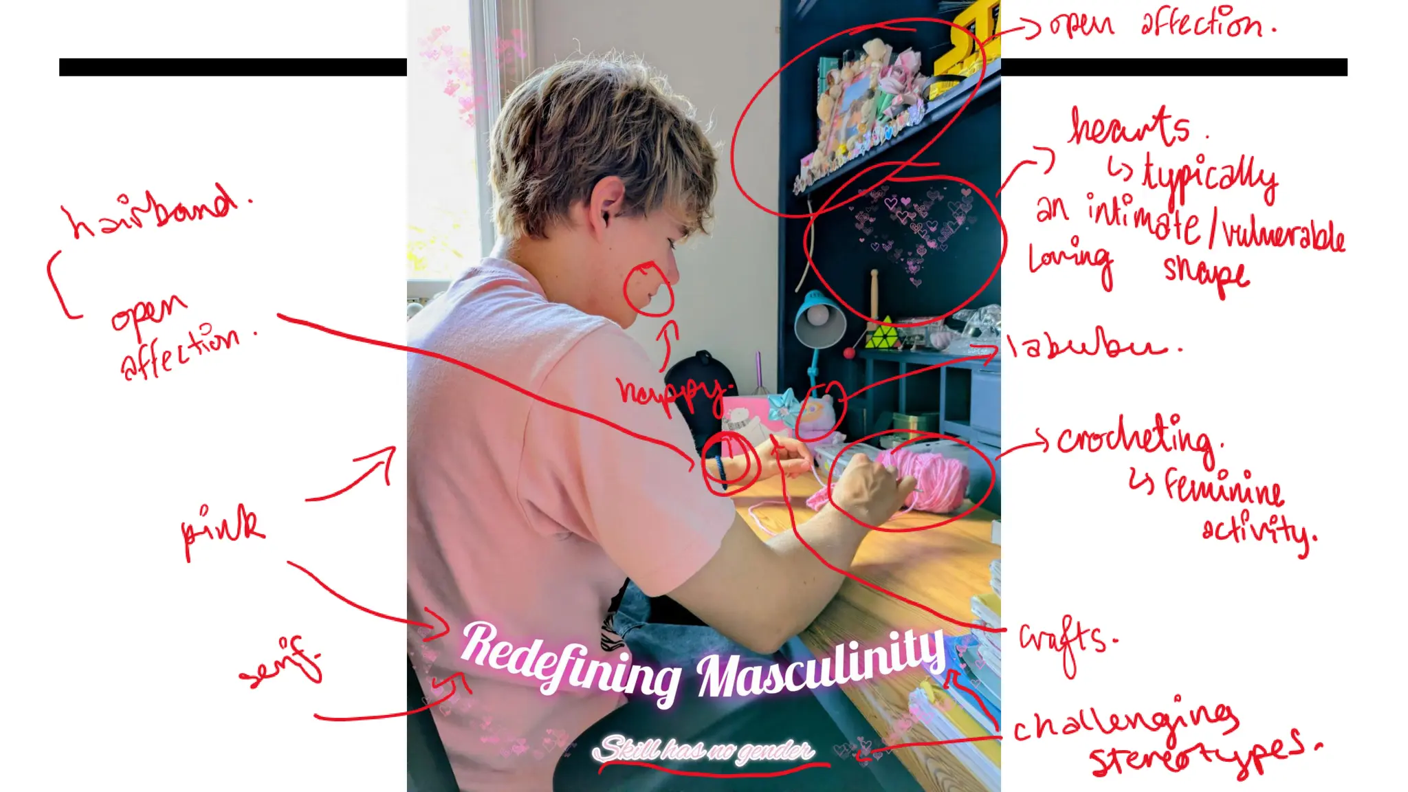 crocheting, the image subverts the dominant ideology that men should only