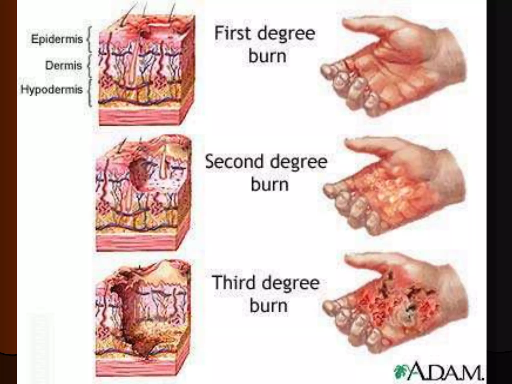 Burn injuries are a major health issue that can cause significant tissue damage and systemic effects. A burn occurs when skin is damaged by heat, electricity, chemicals, friction or radiation. First degree burns involve only the epidermis, while second degree burns extend deeper into the dermis. Third degree burns destroy both the epidermis and dermis. Burn depth, size, and location impact severity and treatment approach. The emergency management of burns focuses on the ABCs - airway, breathing, circulation, disability, exposure and fluid resuscitation based on burn size. Definitive burn care then focuses on wound management and rehabilitation.