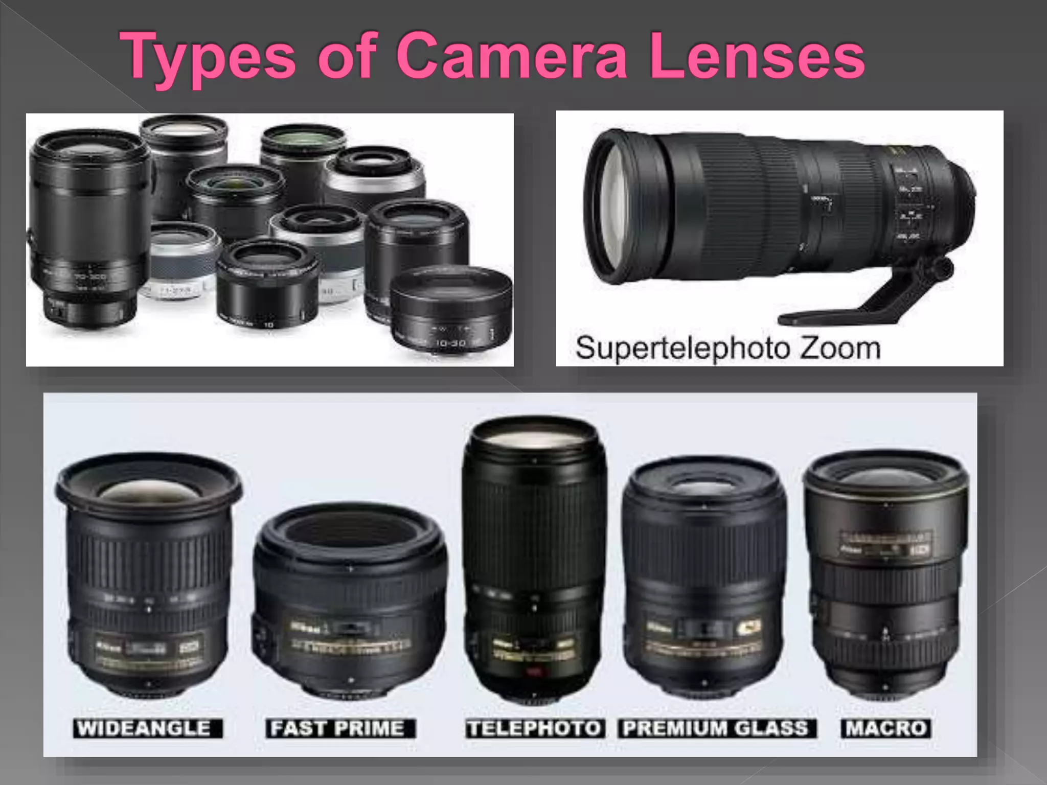 A camera lens focuses light onto the camera's sensor or film. It determines several important factors like focal length, aperture, depth of field, and image quality. There are different types of lenses including prime lenses with a fixed focal length, zoom lenses that can change focal lengths, and specialty lenses like wide angle, telephoto, and macro lenses that serve different photographic needs. The type of lens used affects how much of a scene is captured and the sharpness and clarity of the final image.