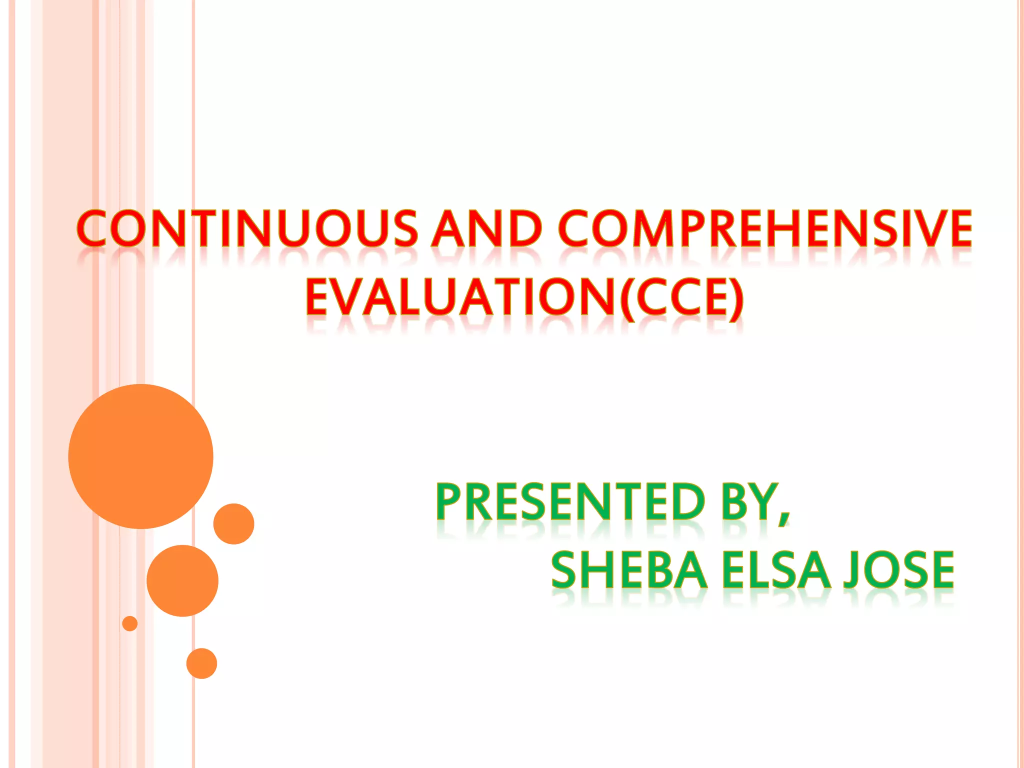 The document discusses continuous and comprehensive evaluation (CCE), which was mandated by the National Policy on Education in 1986. CCE aims to evaluate students in a holistic manner through regular assessment of both scholastic (academic) and co-scholastic (non-academic) areas in order to promote their overall development. It involves assessing students continuously using various tools and techniques, covering curricular and extracurricular activities. The objectives of CCE are to make evaluation part of the teaching-learning process and use it to improve student achievement through diagnosis and remediation.