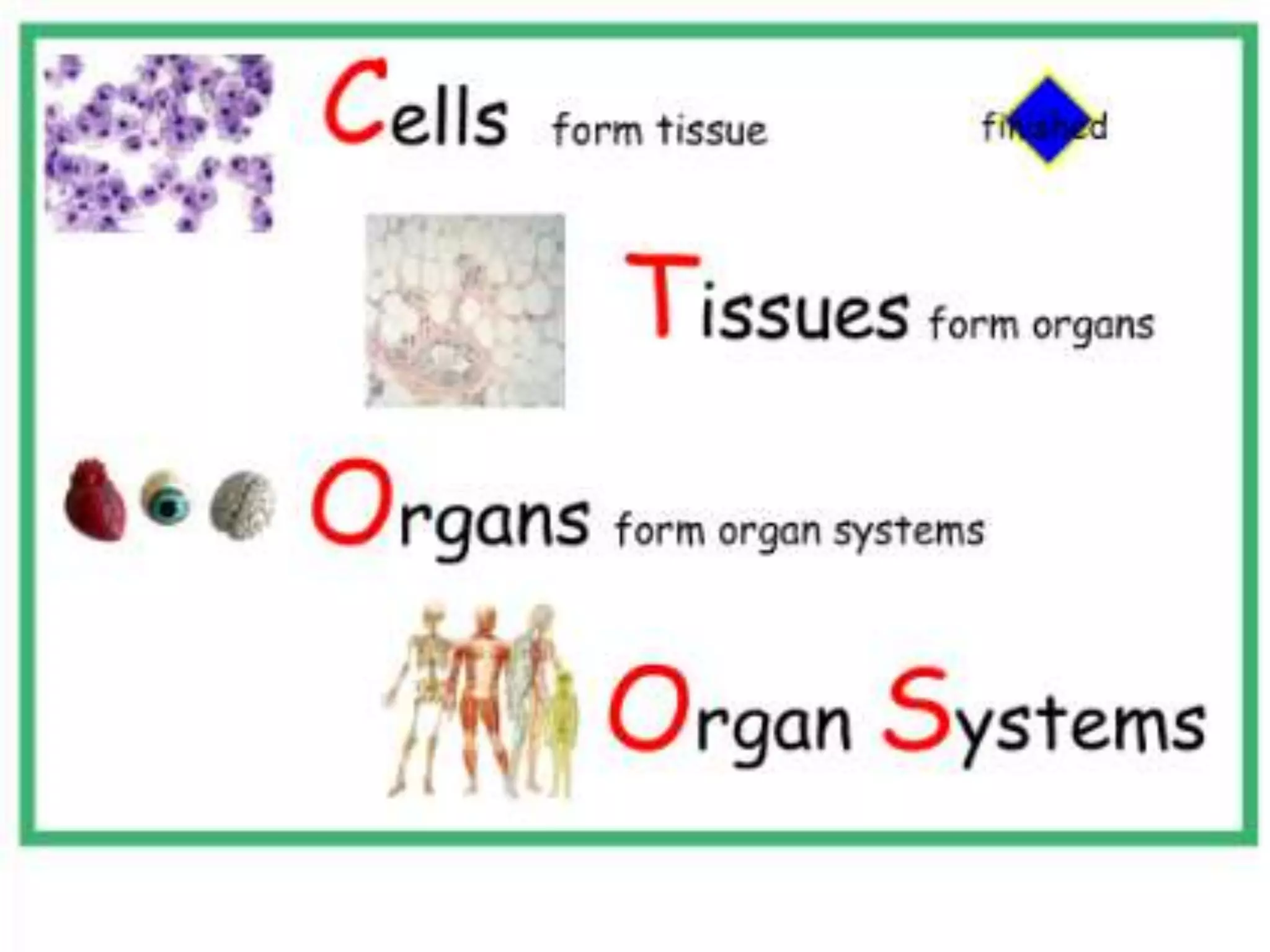 Cells have specialized structures that allow them to perform specific tasks. Tissues are groups of cells that work together, such as epithelial, connective, muscle, and nervous tissues. Organs consist of multiple tissue types and perform major functions. Organ systems group organs to carry out complex jobs like circulation, digestion, and movement. The endocrine system regulates growth and functions through chemical messengers called hormones.