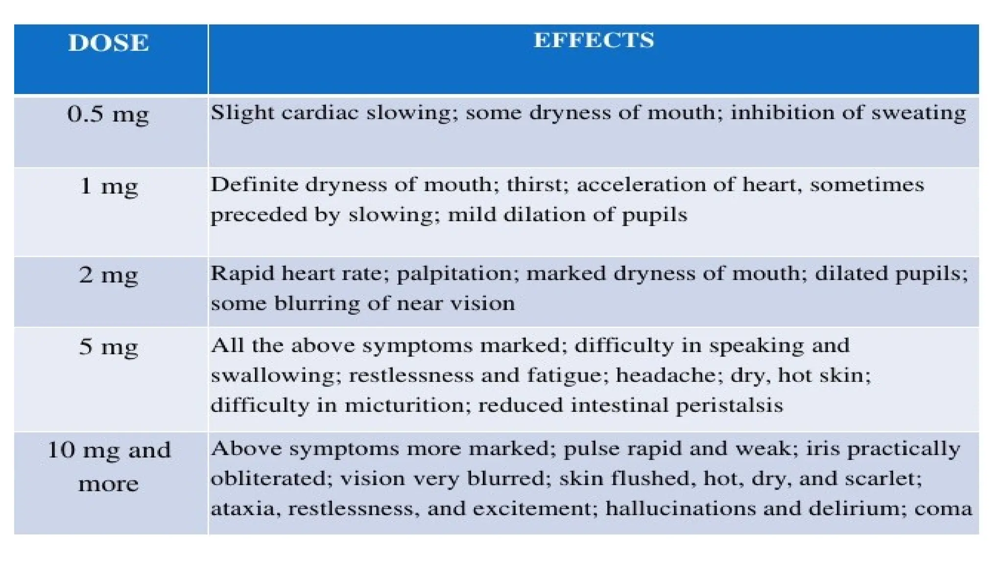 -Dilated pupil, photophobia, blurring of near vision, palpitation