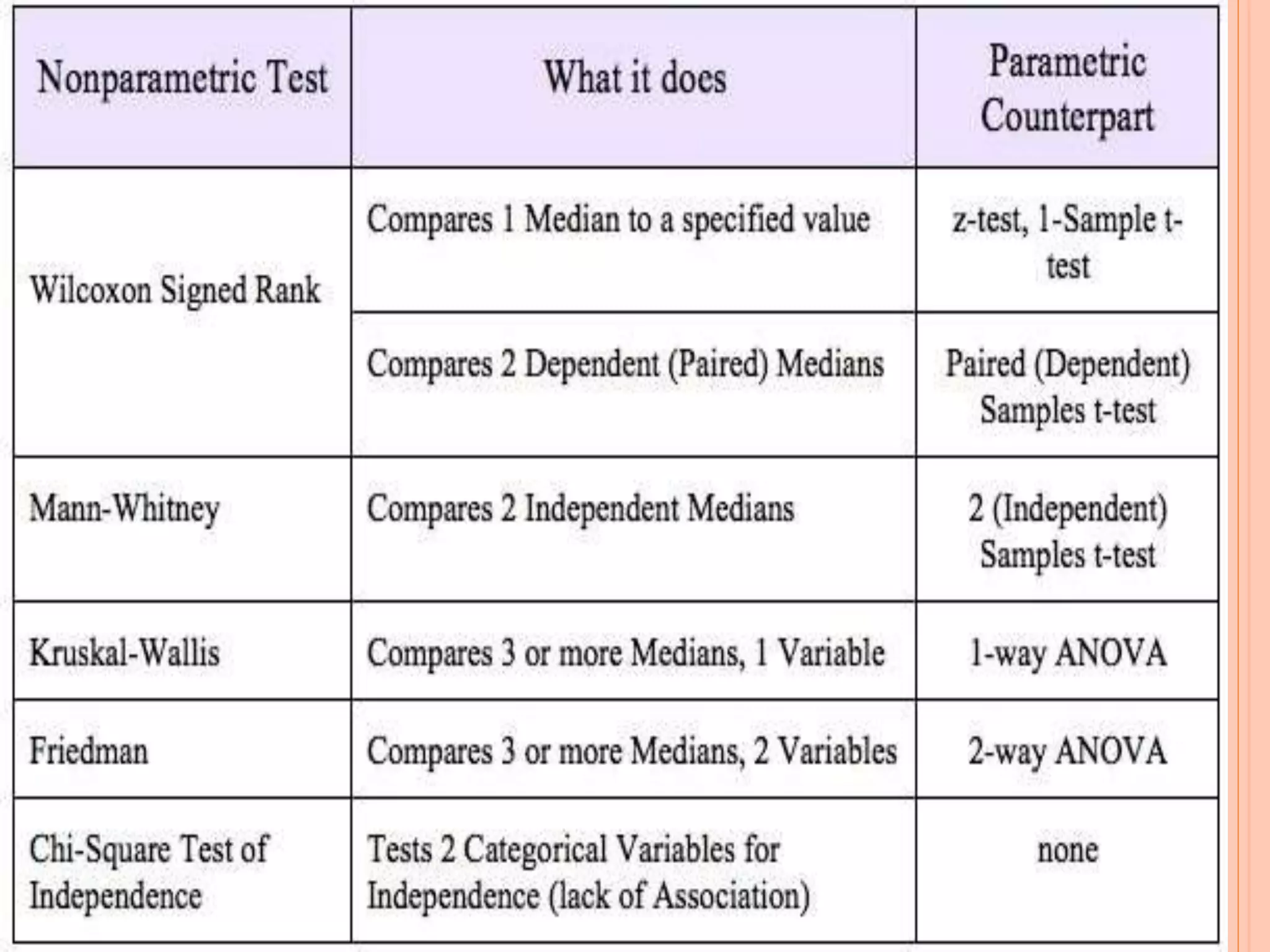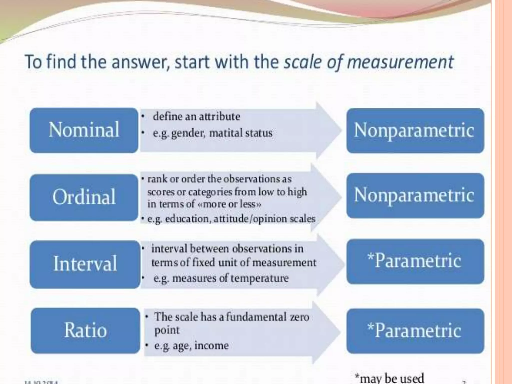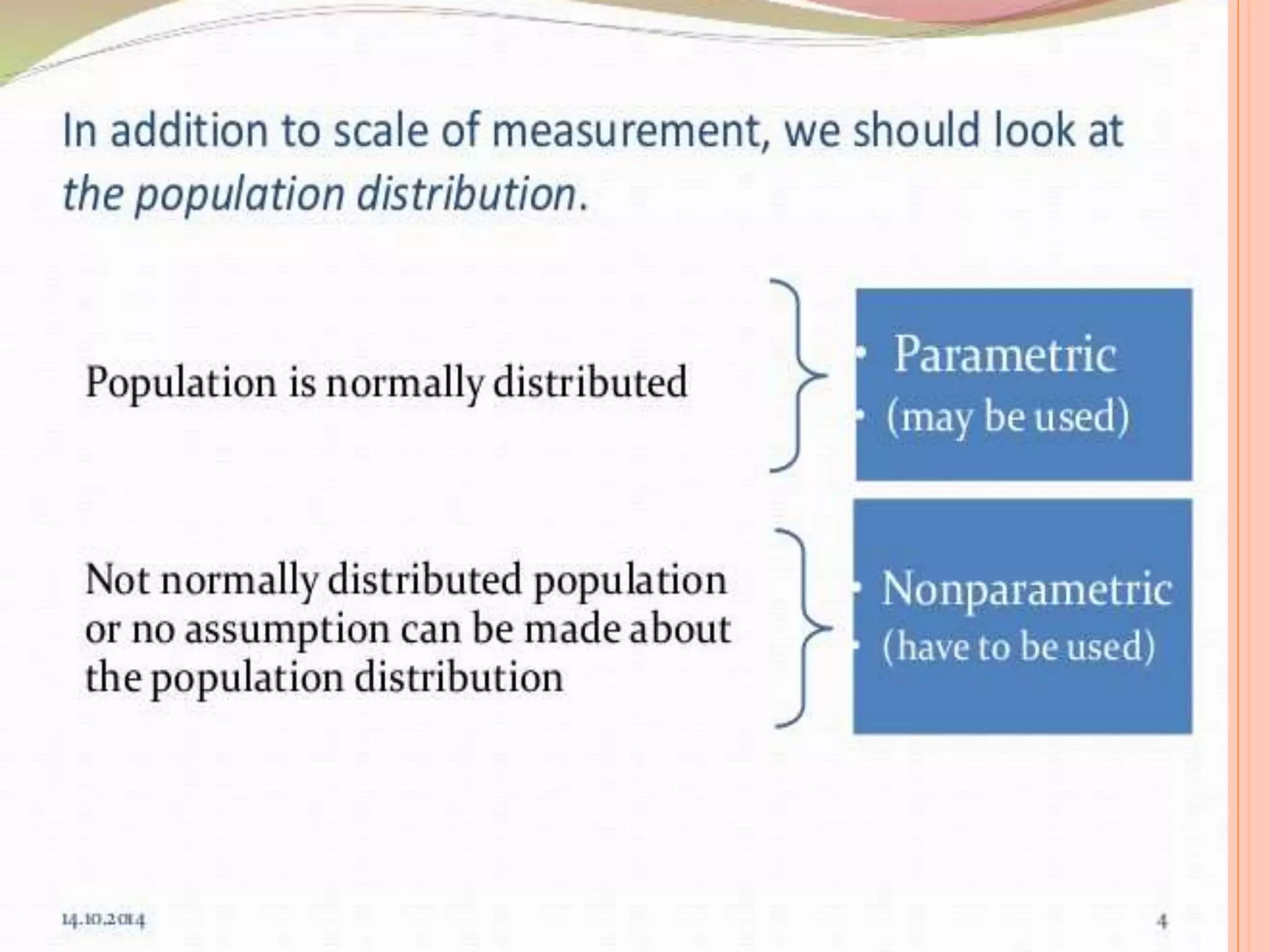 This document provides an overview of different statistical tests used in epidemiological studies and their applications. It discusses topics such as data types (quantitative, categorical), variables, statistics, null and alternative hypotheses, errors in significance testing, and choices between parametric and nonparametric tests. The key information provided includes classifications of variable types, definitions of common statistics, explanations of hypotheses testing and p-values, and guidance on selecting appropriate tests based on the scale and distribution of the data.