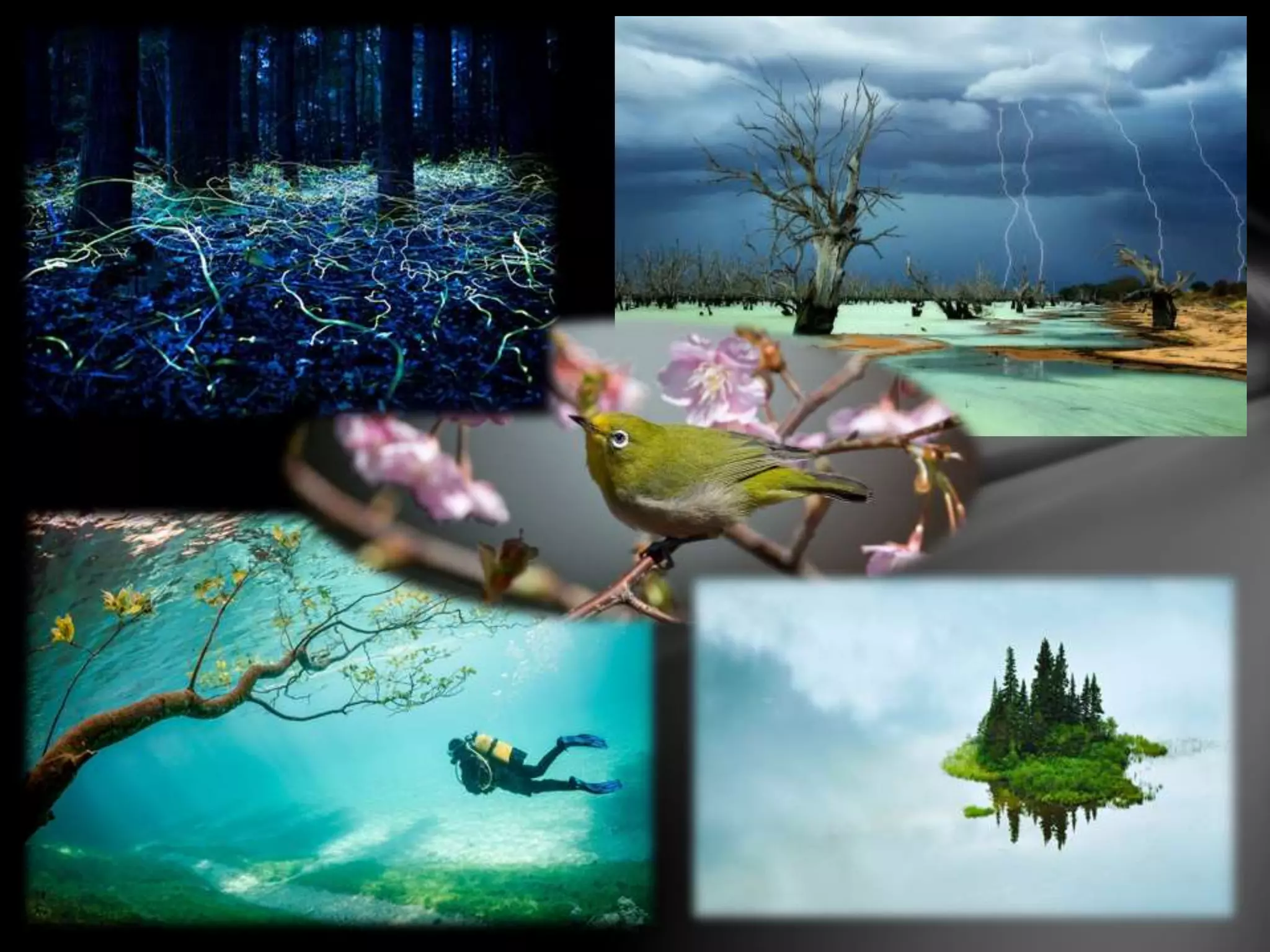 This document contains summaries of 5 photos by different photographers that impacted the author. The first photo by Shane Kalyn shows a ghostly island floating in the clouds in Tumuch Lake, evoking feelings of being lost and free. The second photo by Joe Motohashi contrasts a bird's white eye against blurred flowers, bringing feelings of peace and wonder. The third by Marc Henauer depicts an underwater park in Austria after spring flooding. The fourth by Spencer Black uses long exposure to capture the movement of blue ghost fireflies in a dark forest. The last landscape photo by Julie Fletcher shows a beach with lightning-struck trees during a perfect disaster.