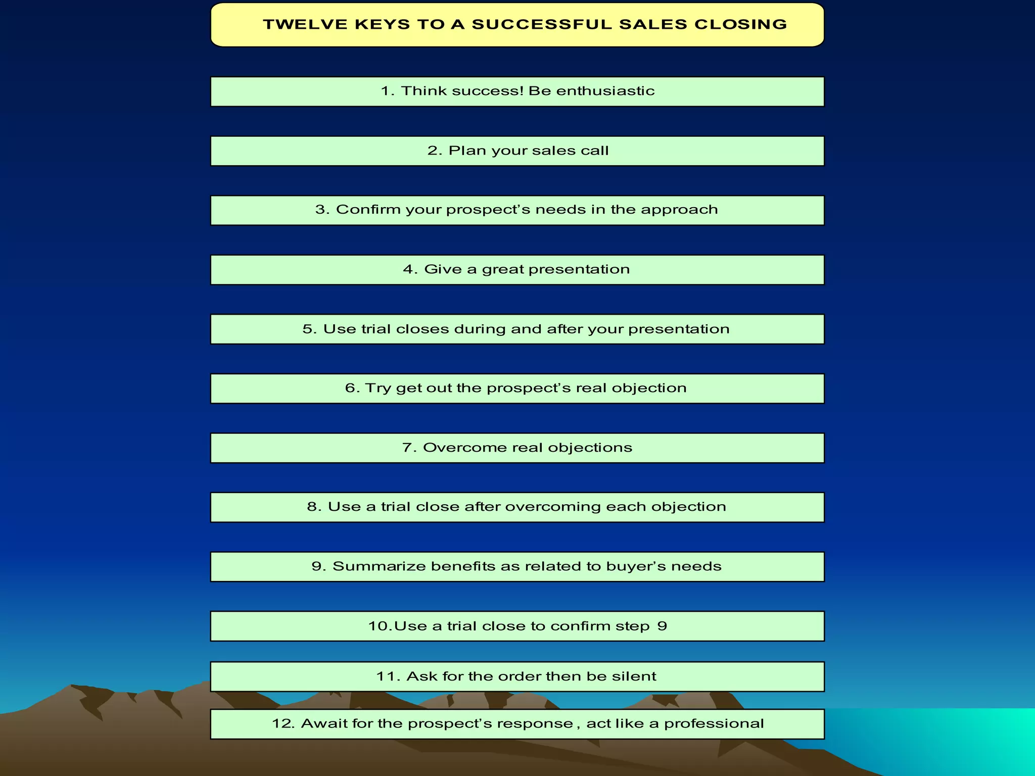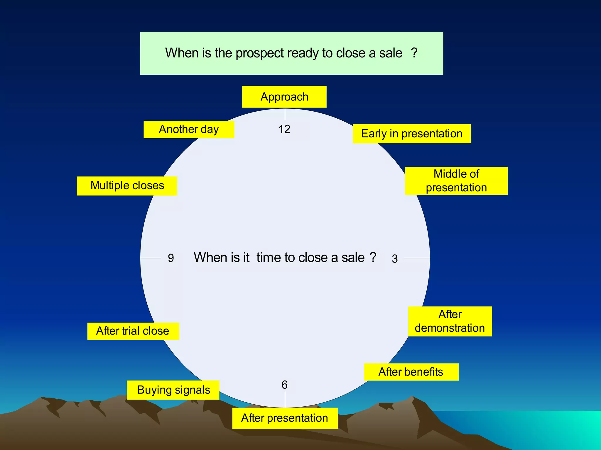 The document provides guidance on when and how to close a sale. It advises closing a sale only when the buyer is in the "conviction stage" and ready to buy. It outlines buying signals that indicate readiness, such as repeating questions or asking for pricing. The document also discusses qualities of effective closers, techniques for closing, using visual aids, handling rejections professionally, and learning from successes and failures.