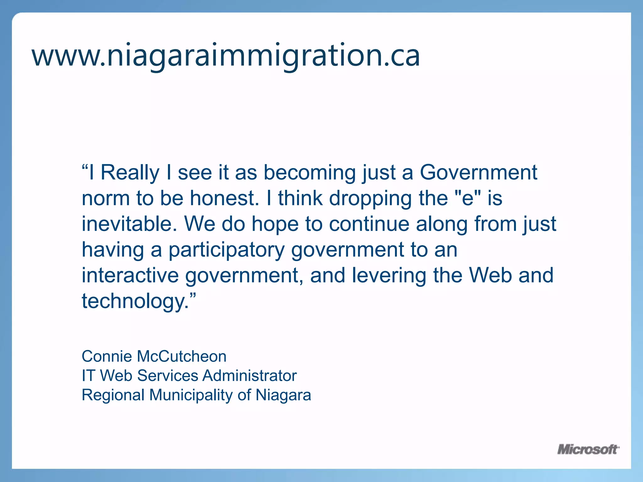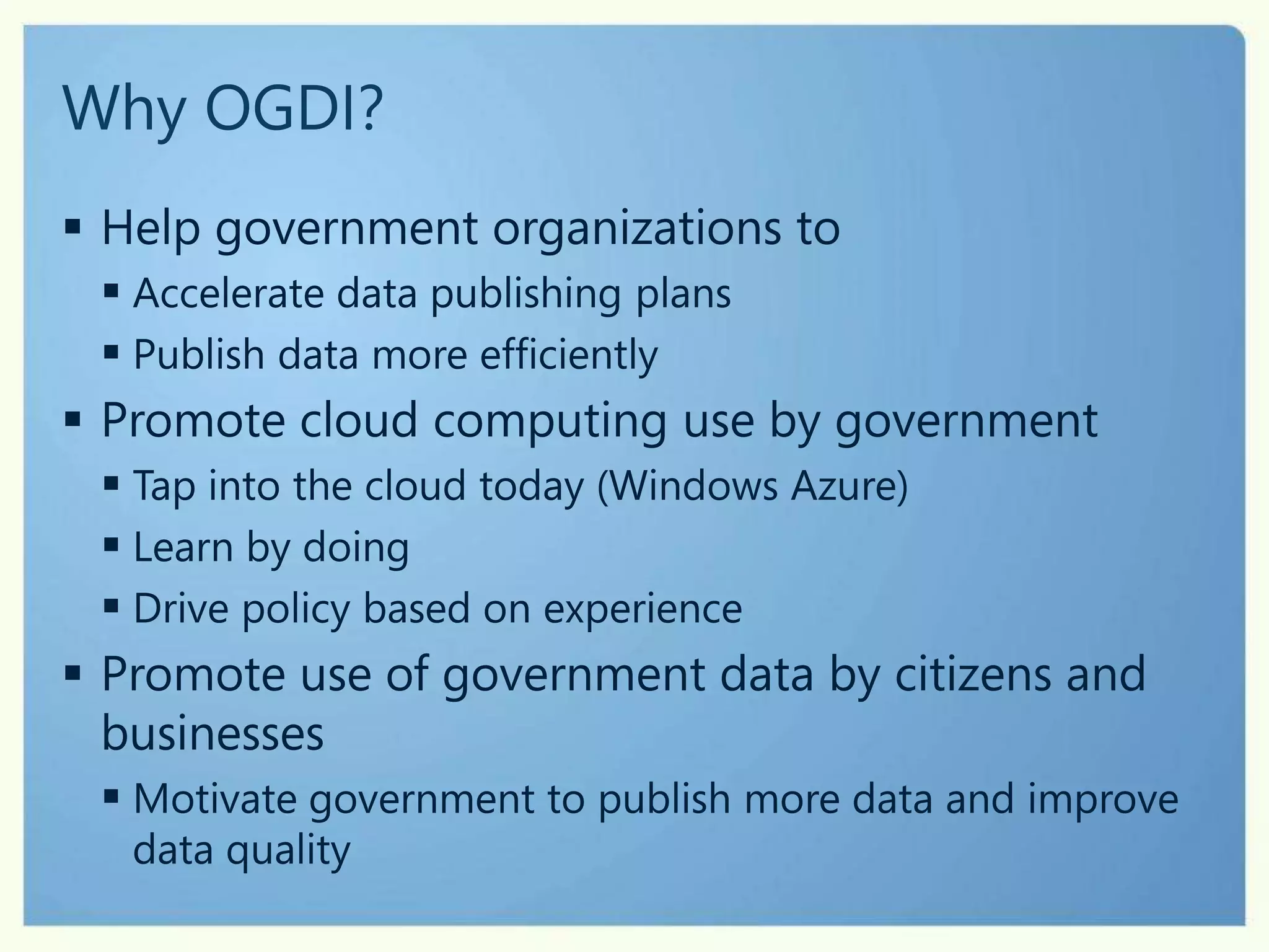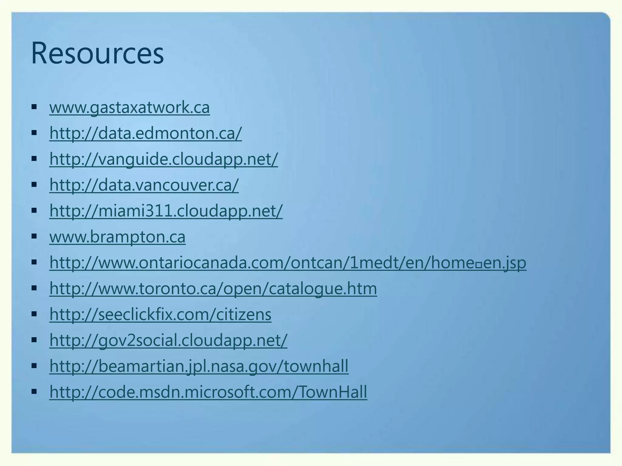 Using technology can help governments better engage citizens and meet increasing expectations with fewer resources. Examples show how governments are leveraging open data and cloud services to improve citizen services. Edmonton, Vancouver, and other cities publish data on platforms like Microsoft's Open Government Data Initiative to encourage public participation and transparency. This allows governments to deliver better services and experiences to citizens through multi-channel engagement.