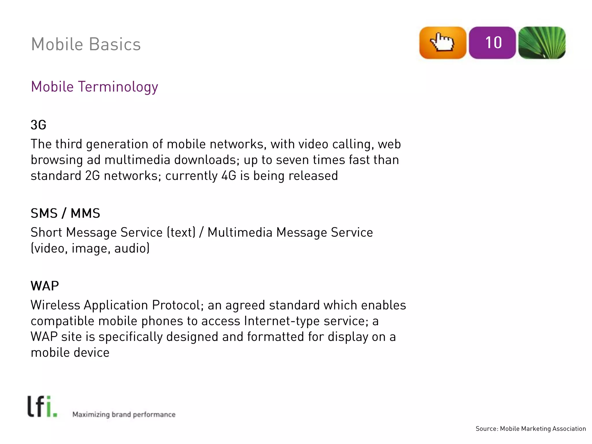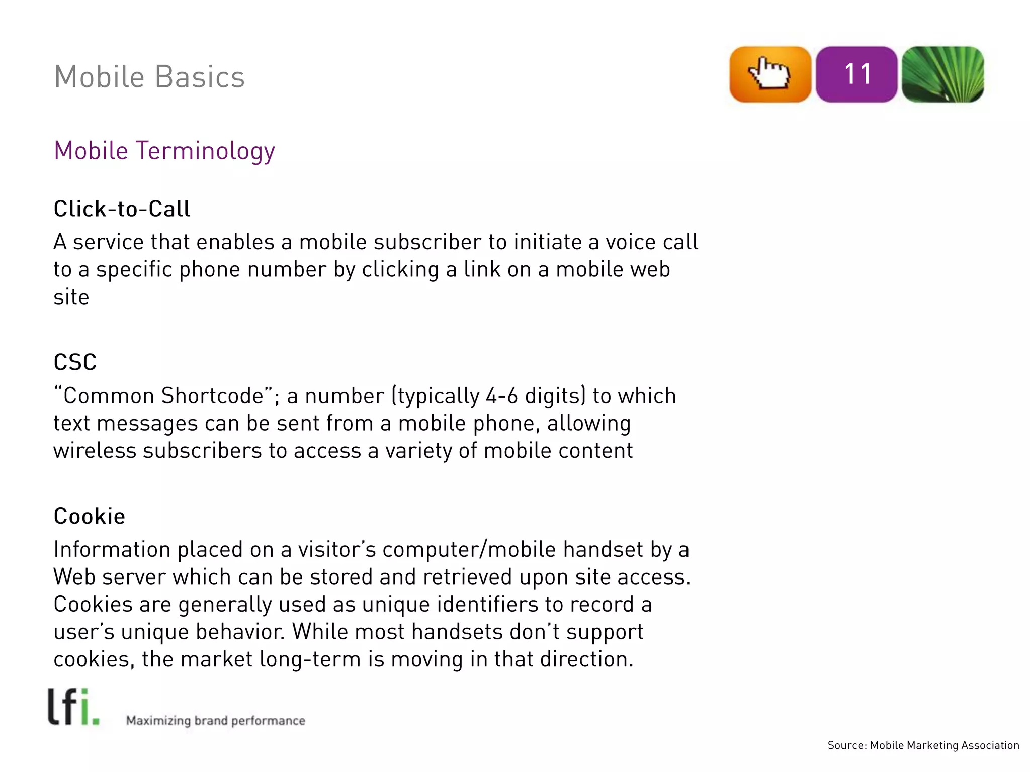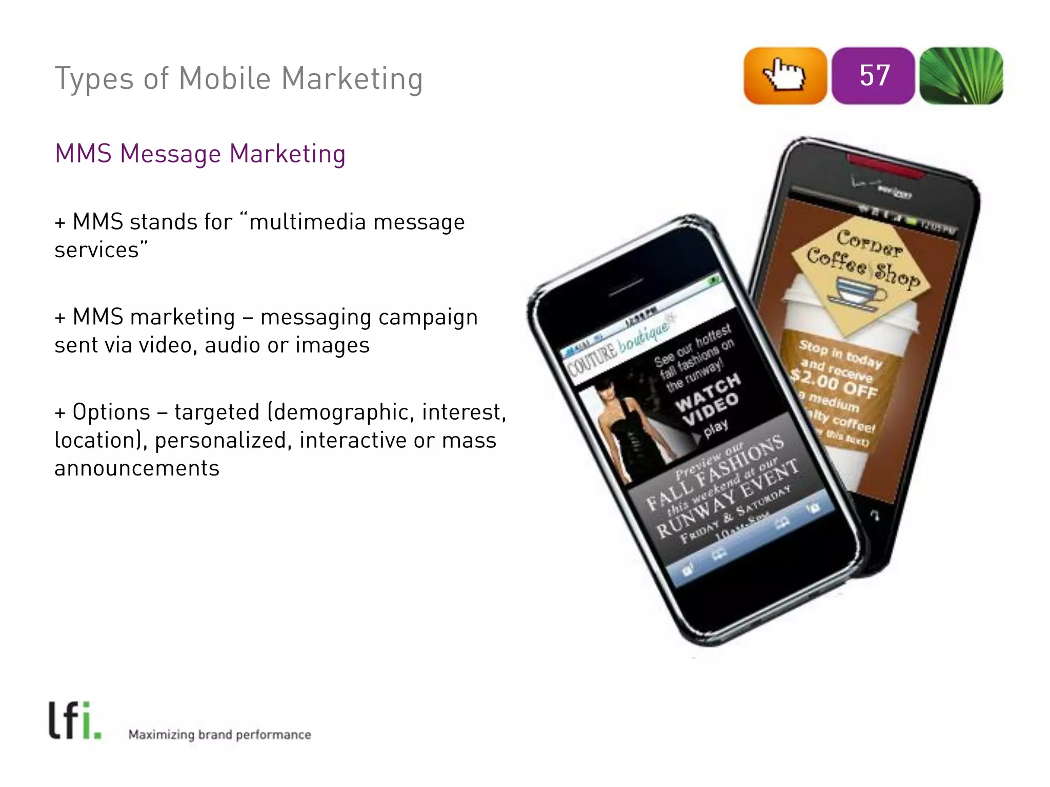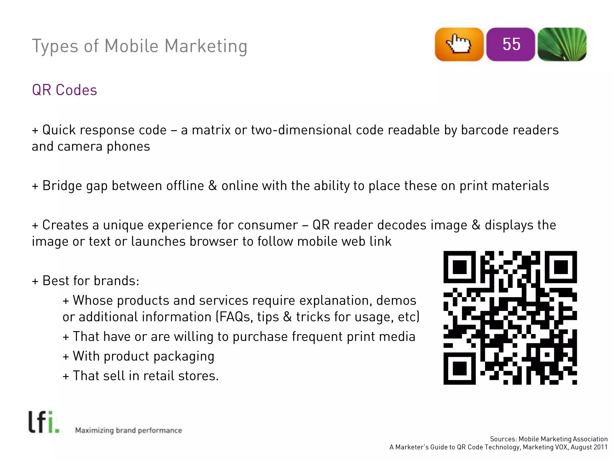 The document is an infographic from the Mobile Marketing Association that outlines different types of mobile marketing strategies and tactics. It shows that smartphones are being used for tasks while tablets are better for consuming richer content and leisure experiences. It then lists and defines various mobile marketing channels including in-app ads, mobile display, mobile promotions in apps, MMS campaigns, SMS messaging, QR codes, mobile search (both organic and paid), geo-fencing, and mobile couponing. The infographic cites its sources as the Mobile Marketing Association and Digital Buzz Blog.