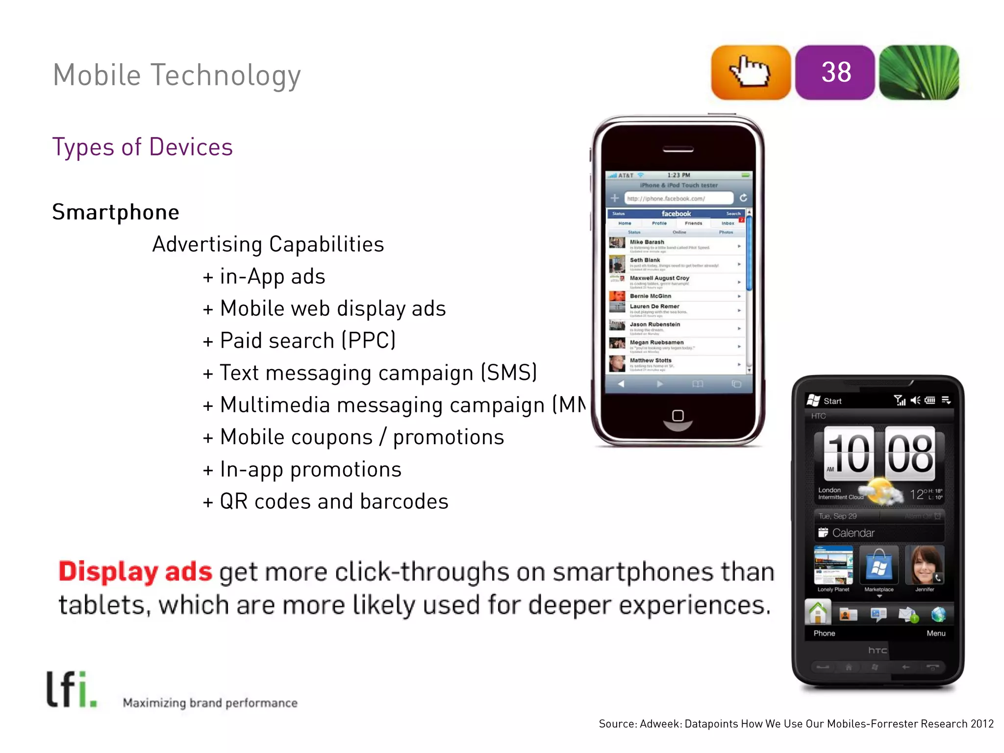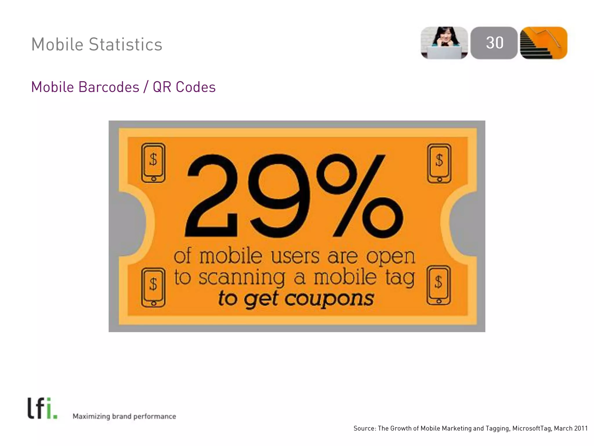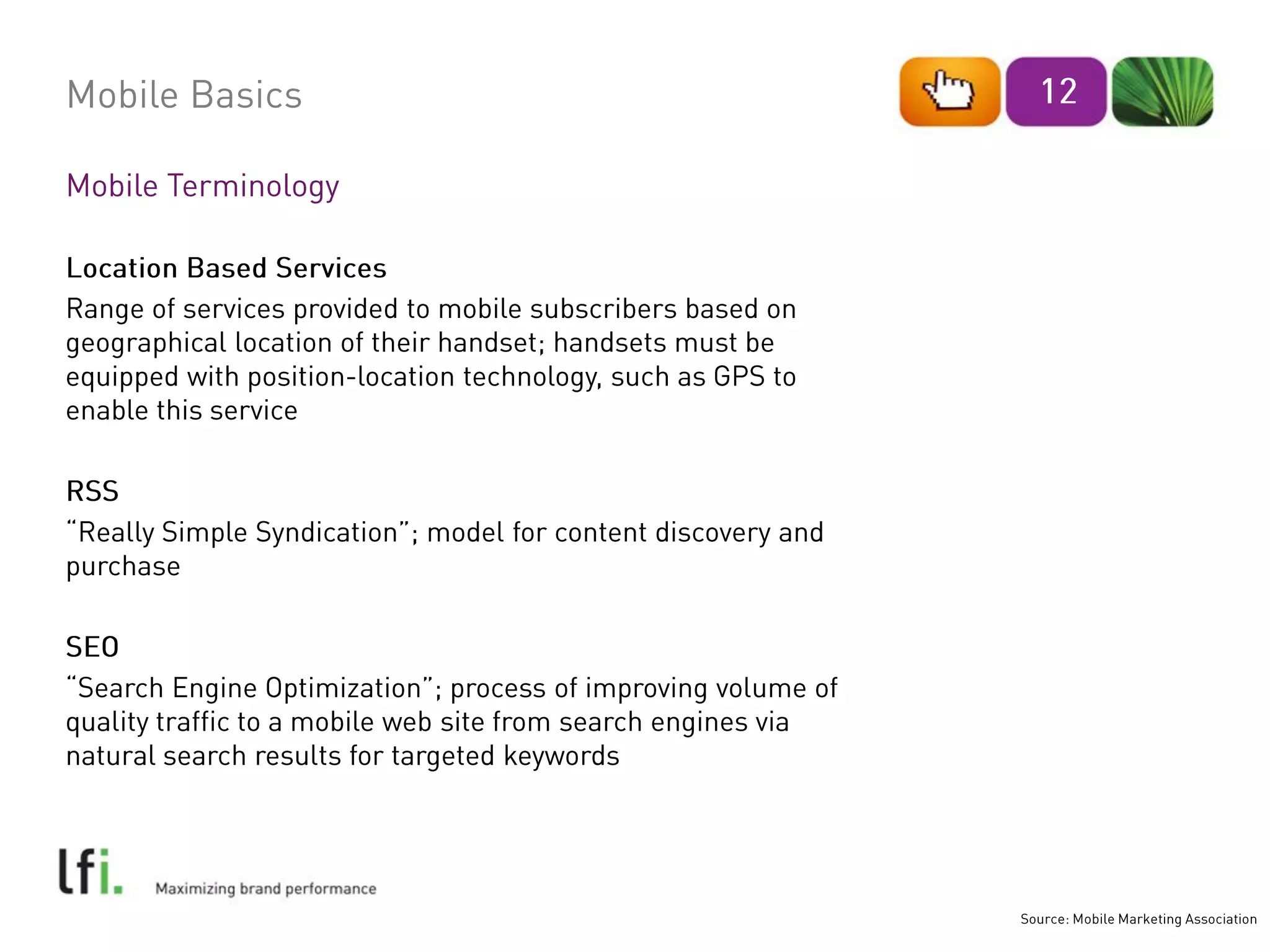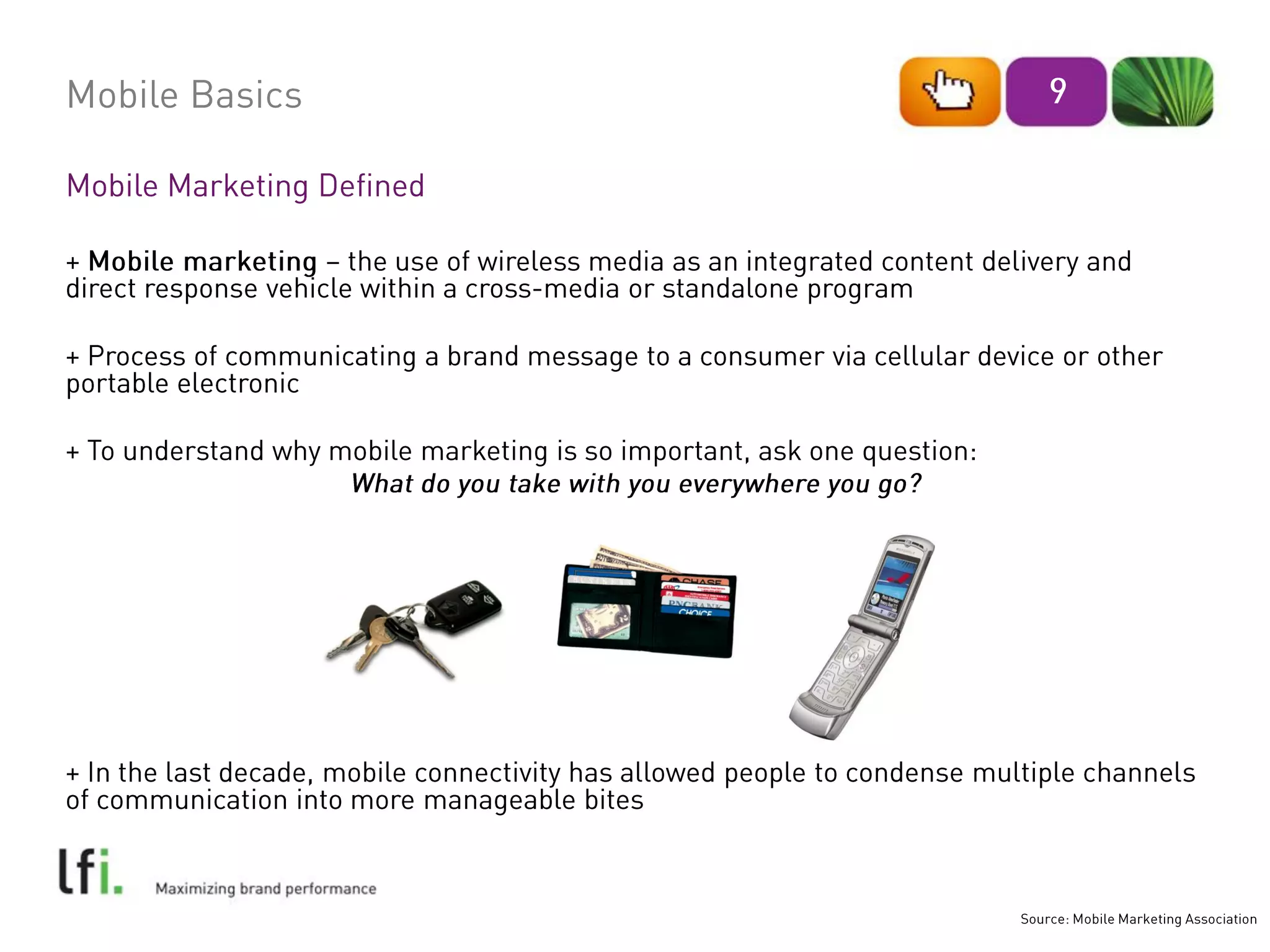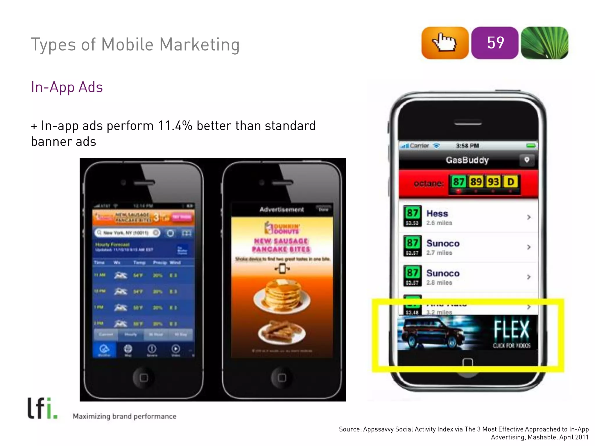 The document is an infographic from the Mobile Marketing Association that outlines different types of mobile marketing strategies and tactics. It shows that smartphones are being used for tasks while tablets are better for consuming richer content and leisure experiences. It then lists and defines various mobile marketing channels including in-app ads, mobile display, mobile promotions in apps, MMS campaigns, SMS messaging, QR codes, mobile search (both organic and paid), geo-fencing, and mobile couponing. The infographic cites its sources as the Mobile Marketing Association and Digital Buzz Blog.