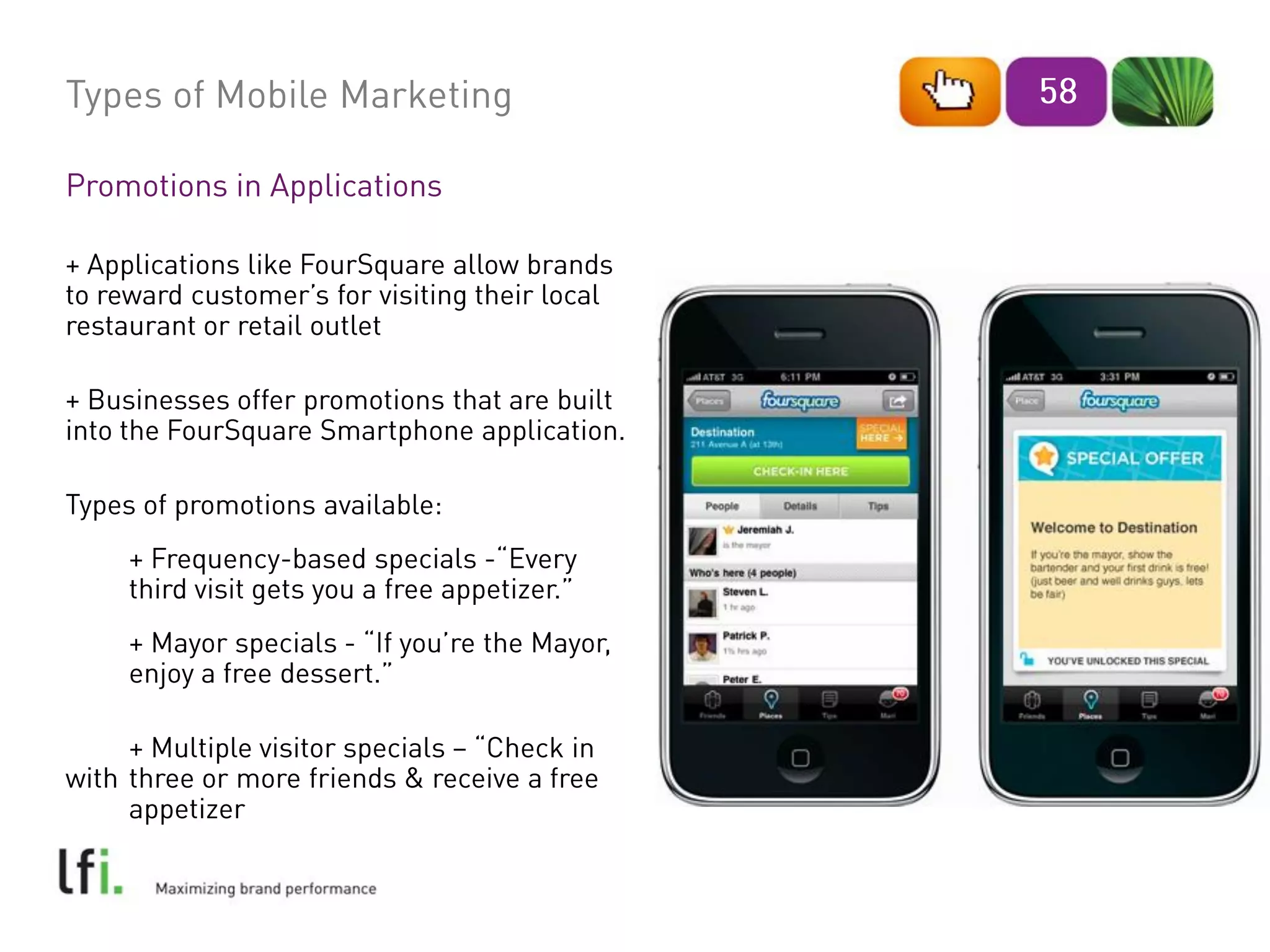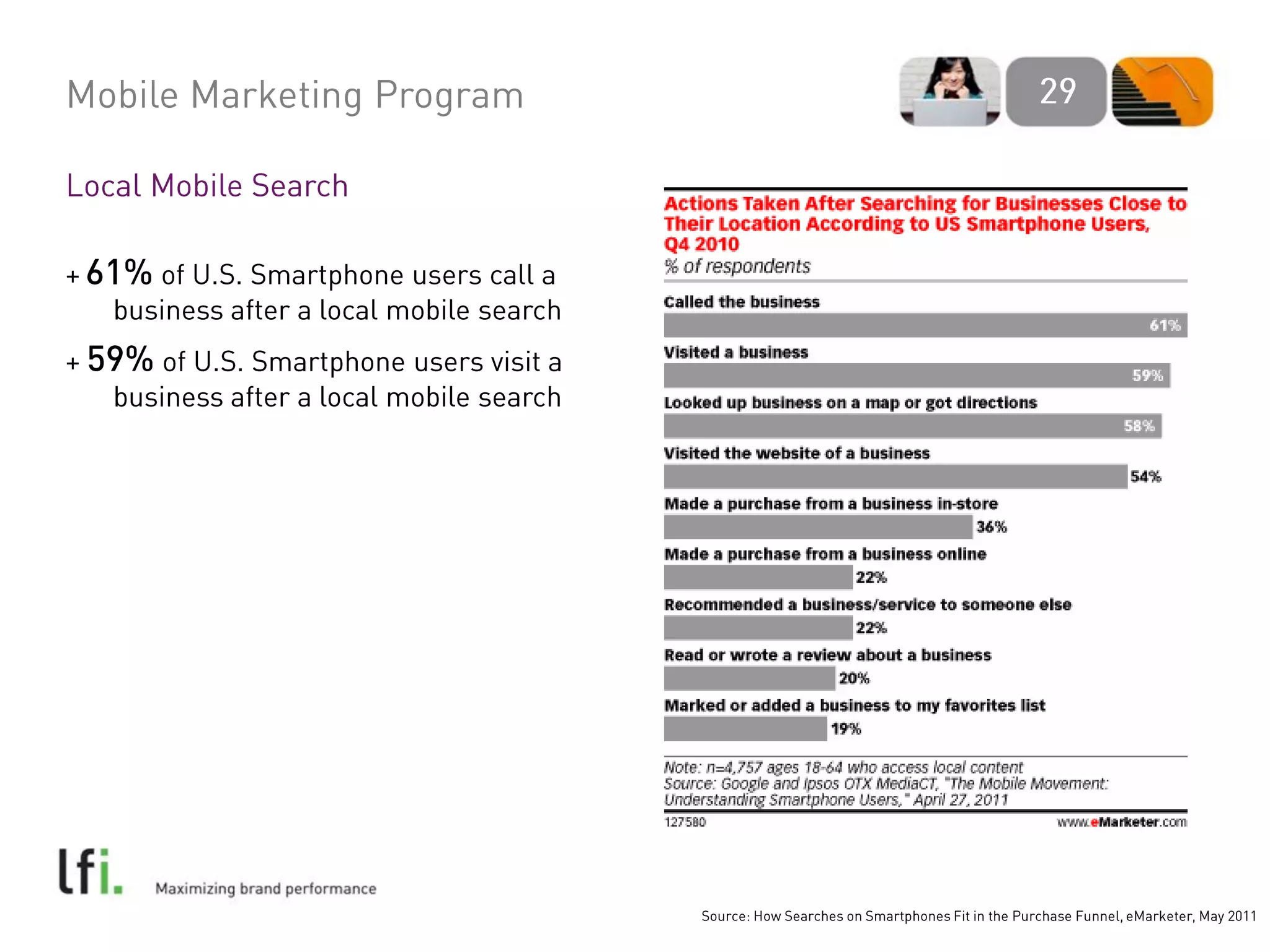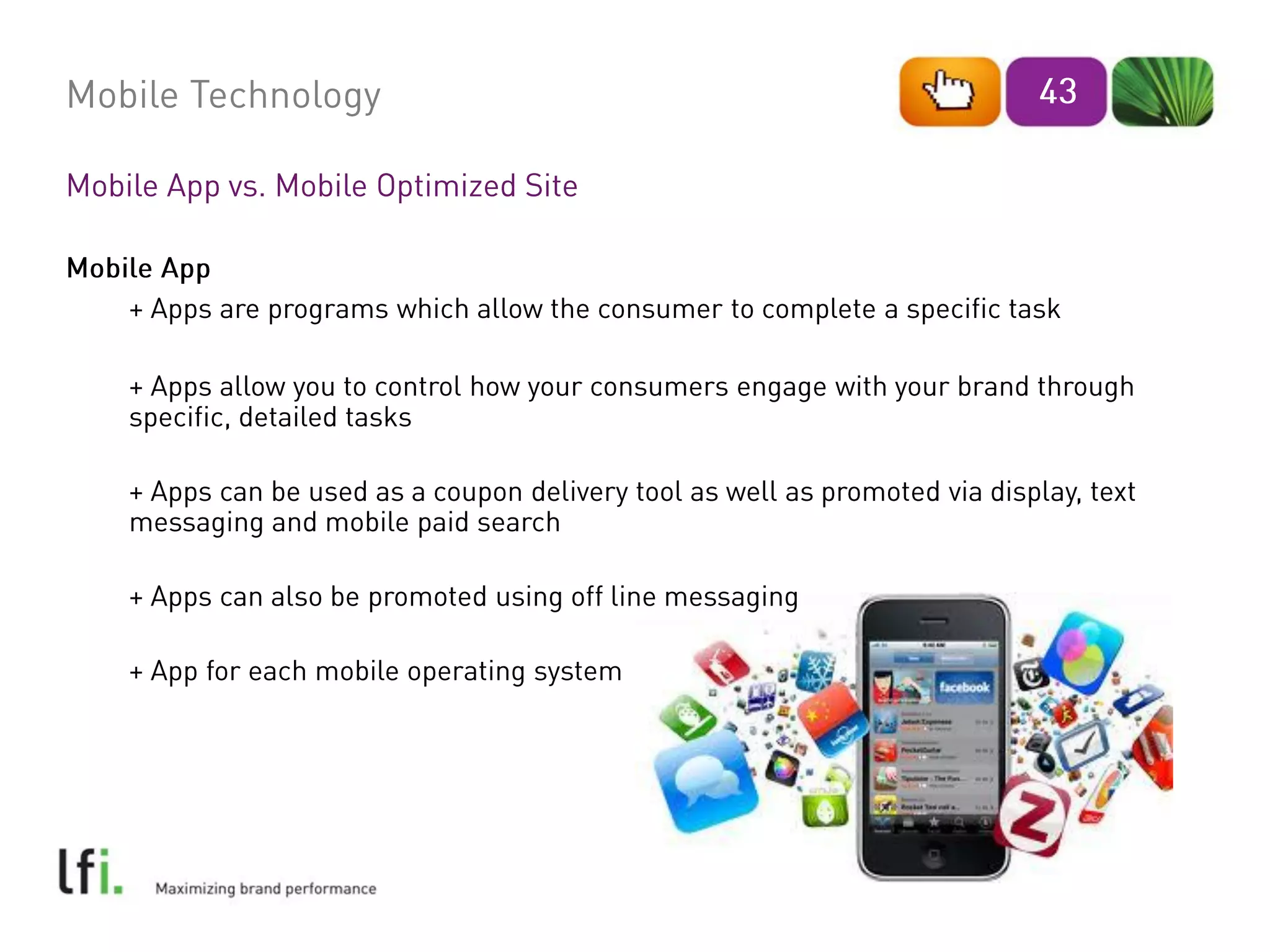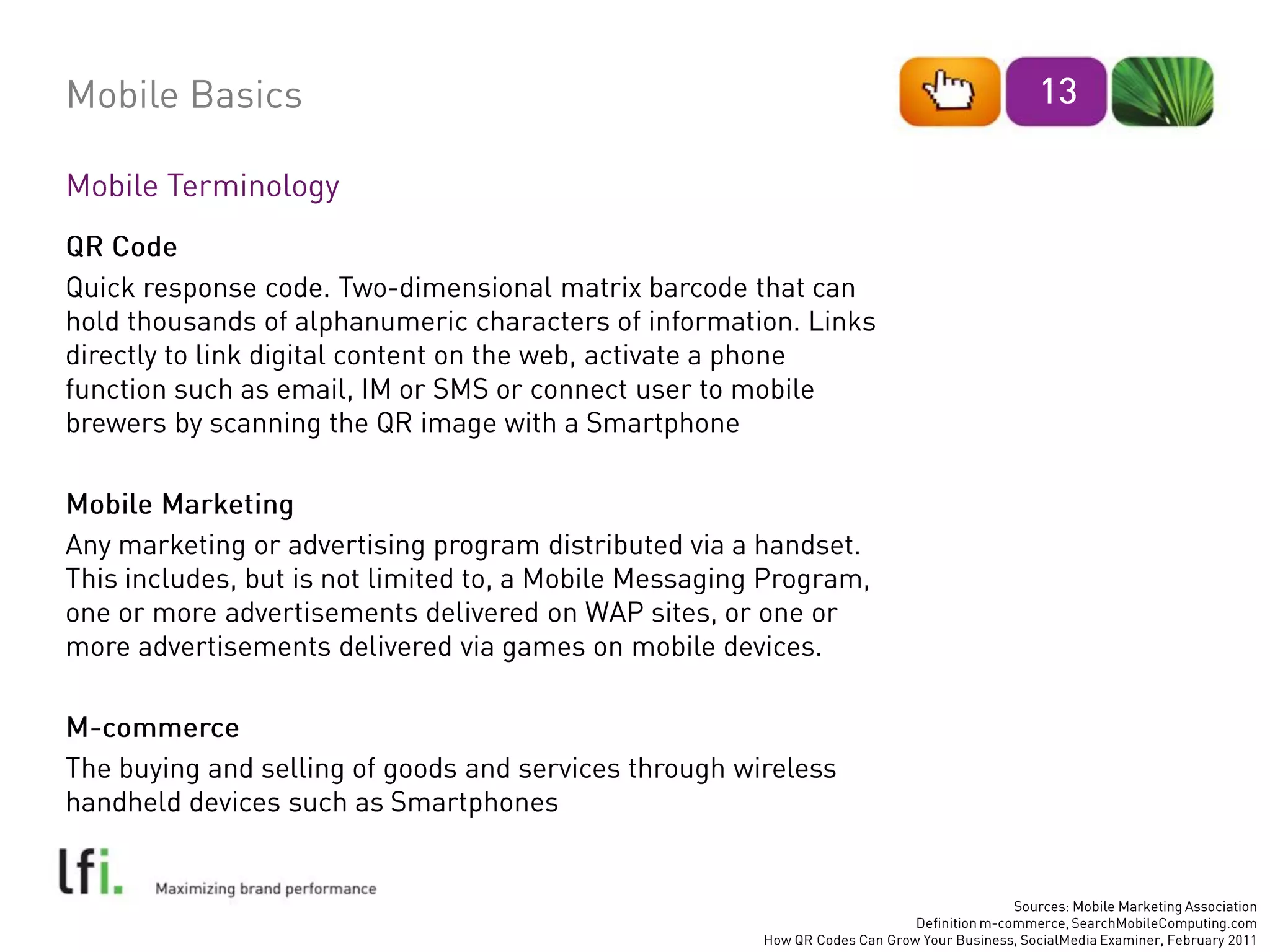 The document is an infographic from the Mobile Marketing Association that outlines different types of mobile marketing strategies and tactics. It shows that smartphones are being used for tasks while tablets are better for consuming richer content and leisure experiences. It then lists and defines various mobile marketing channels including in-app ads, mobile display, mobile promotions in apps, MMS campaigns, SMS messaging, QR codes, mobile search (both organic and paid), geo-fencing, and mobile couponing. The infographic cites its sources as the Mobile Marketing Association and Digital Buzz Blog.